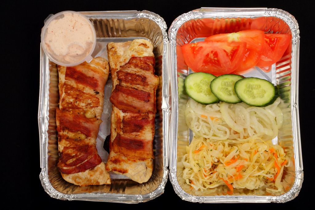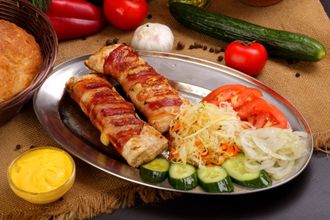Гриль сет Куриное филе с сыром в беконе 500 гр Это два больших рулета из куриного филе паршированное сыром и обернутое в ароматный бекон. Все это пожарено на углях бекон становиться хрустящим а сыр плавиться делая куриное филе еще более сочным.