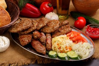 В подарок к гриль сету: свежие помидоры, огурцы, маринованный лук, салат из капусты, 2 соуса на выбор и 4 сербские лепешки.